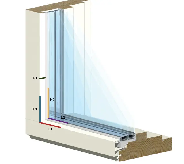 Mittaa lasin leveys (L2) ja lasin korkeus (H2). Muista sisällyttää mittaukseen puolet mustasta lasin tiivisteestä. Tämä mitta on myös vekkikaihtimen kankaan leveys. Kaihdin kiinnitetään lasituslistoihin ruuveilla. Tuotepakkauksessa on mukana erityinen sovitin, joka helpottaa kiinnikkeiden tarkan paikan määrittämistä.